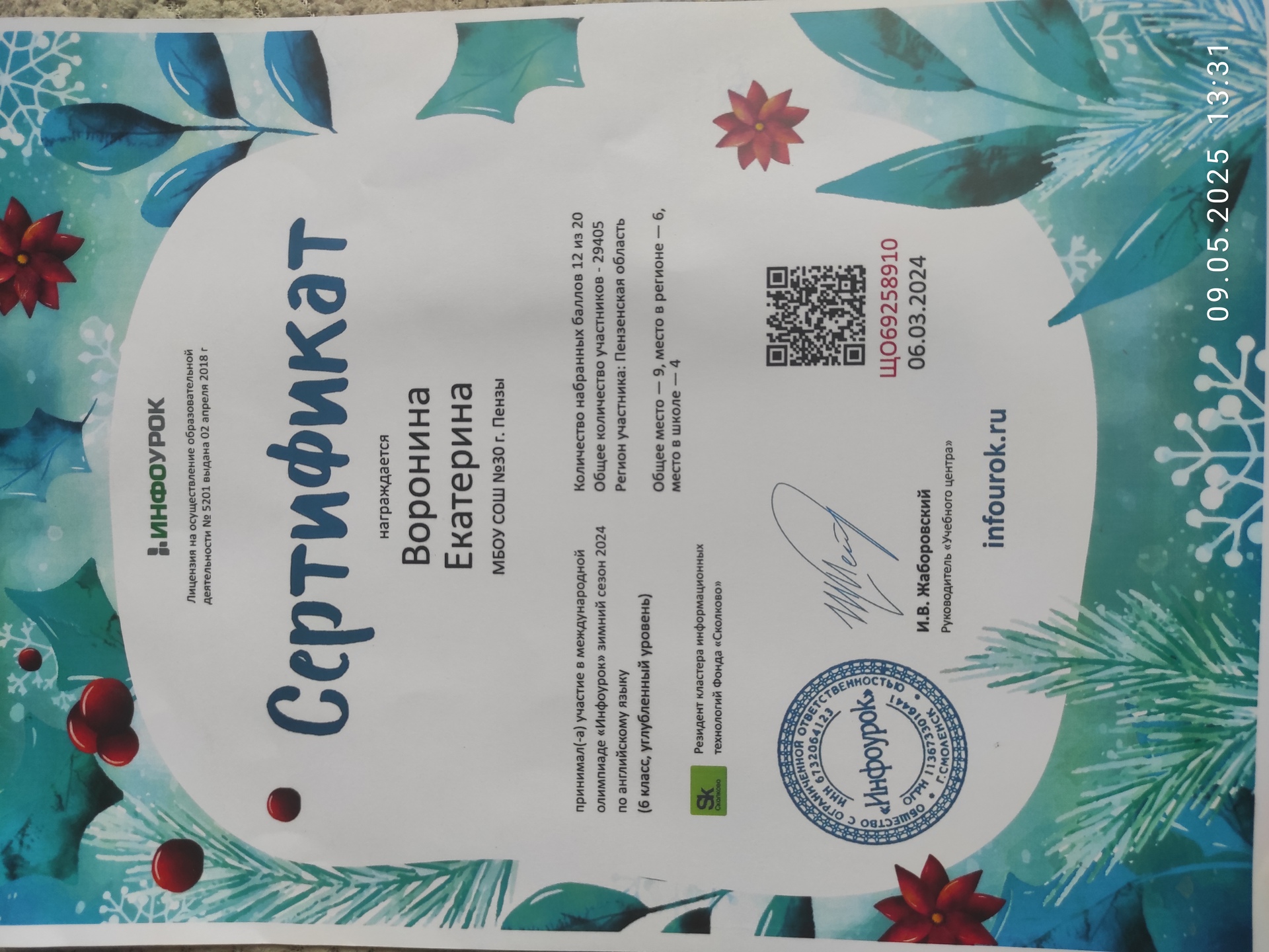 Общее место 9, место в регионе - 6, место в школе - 4